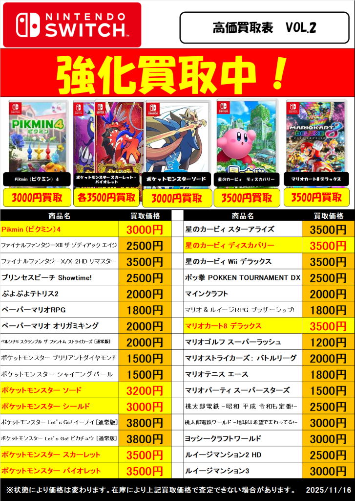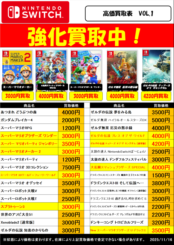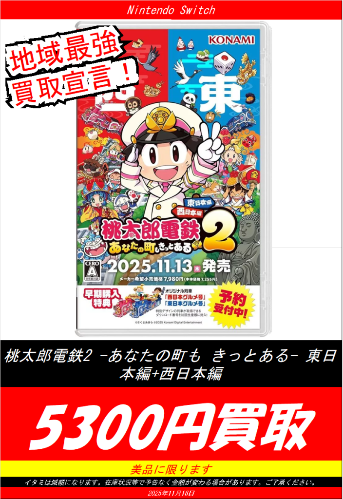 switchソフト買取表追加しました! 2025年11月16日 恵那店 admin_booktown ★新作の桃鉄買取大募集です★ もちろん定番タイトルも併せて買取大募集してます!! 遊び終わったソフト、是非お持ち込みください!!