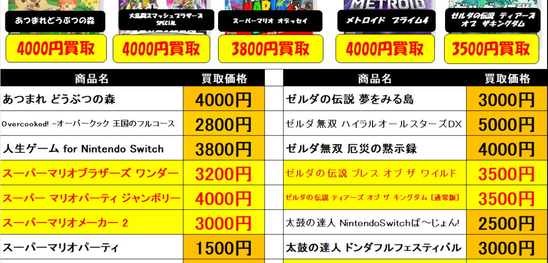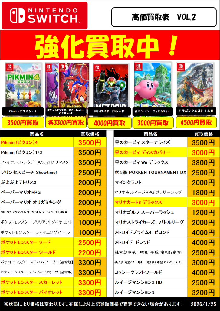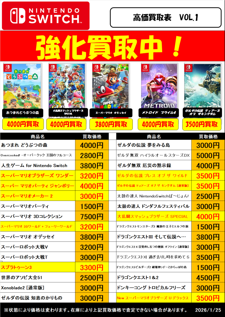 ★switchソフト高価表更新★ 2026年1月25日 恵那店 admin_booktown switchソフトの高価表更新しました! ★今回はこれまでのタイトルから一部タイトルを変更しています★ 遊び終わったソフトは是非お持ち込みください!