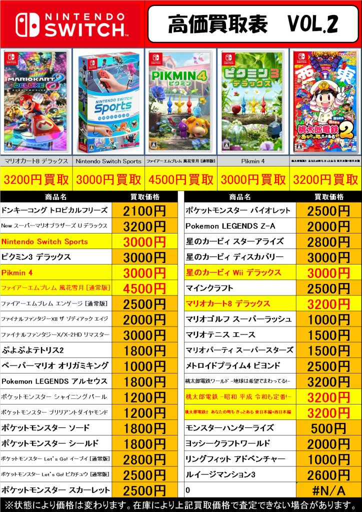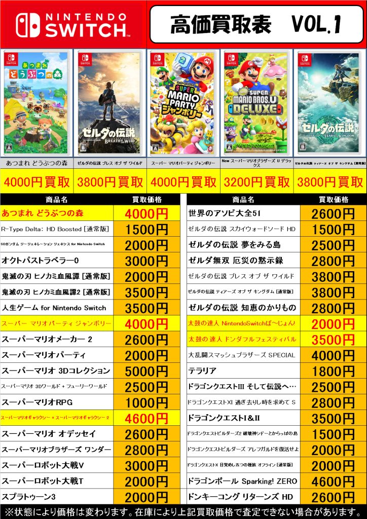 ニンテンドースイッチソフト 買取表 今渡店 2026年4月11日 今渡店 SWITCH, 高価表 admin_booktown HOMEお問い合わせお問い合わせありがとうございますブログ会社情報出張買取売りたい方へトレカ買取マンガ買取フィギュア・ホビー買取ゲーム買取デジタル機器買取CD・DVD買取店舗を探す多治見店恵那店瑞浪店津島店今渡店犬山五郎丸店関店求人情報採用に関するお問い合わせお問い合わせありがとうございます買いたい方へ