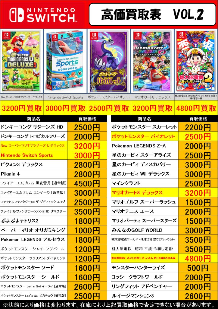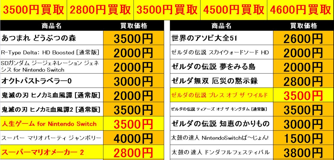 ニンテンドーswitch ソフト 買取表 今渡店