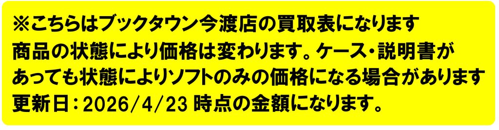 | 商品名 | ソフトのみ買取金額 | 完品買取金額 | JANコード | |
