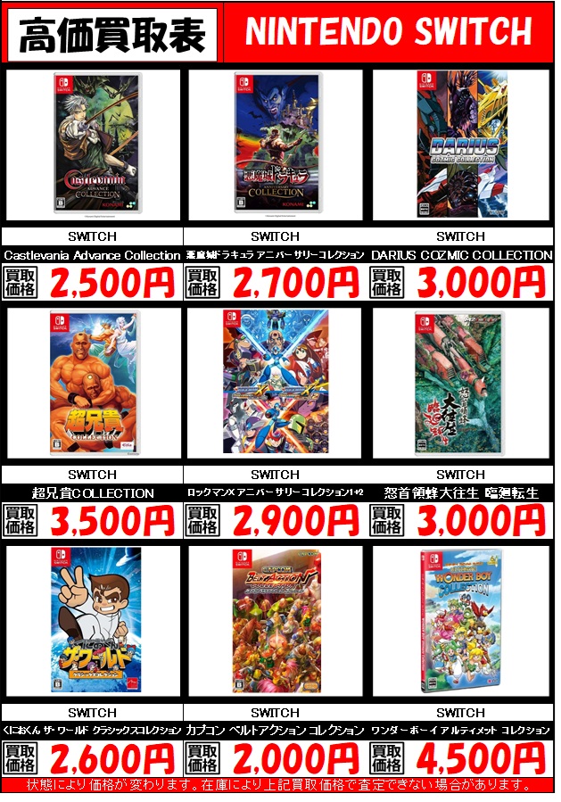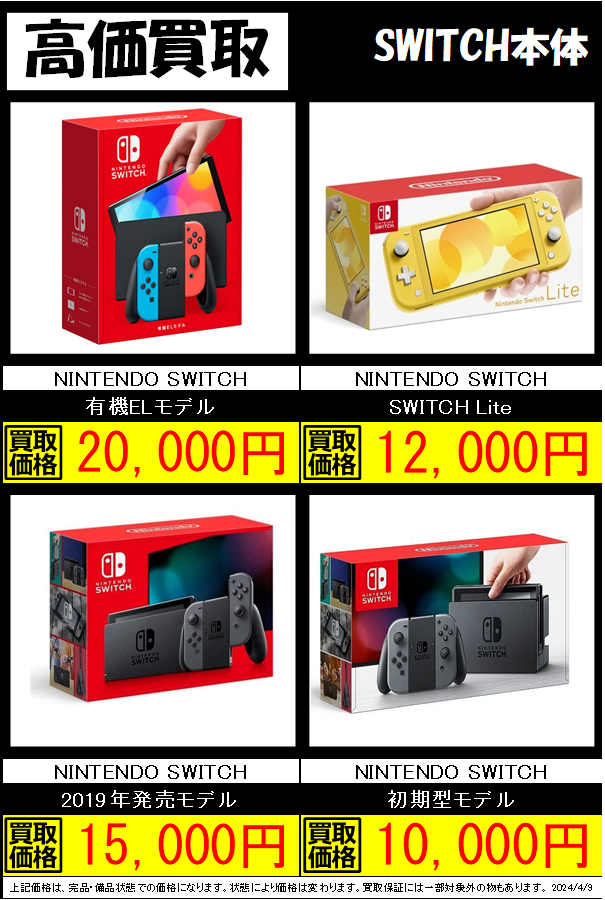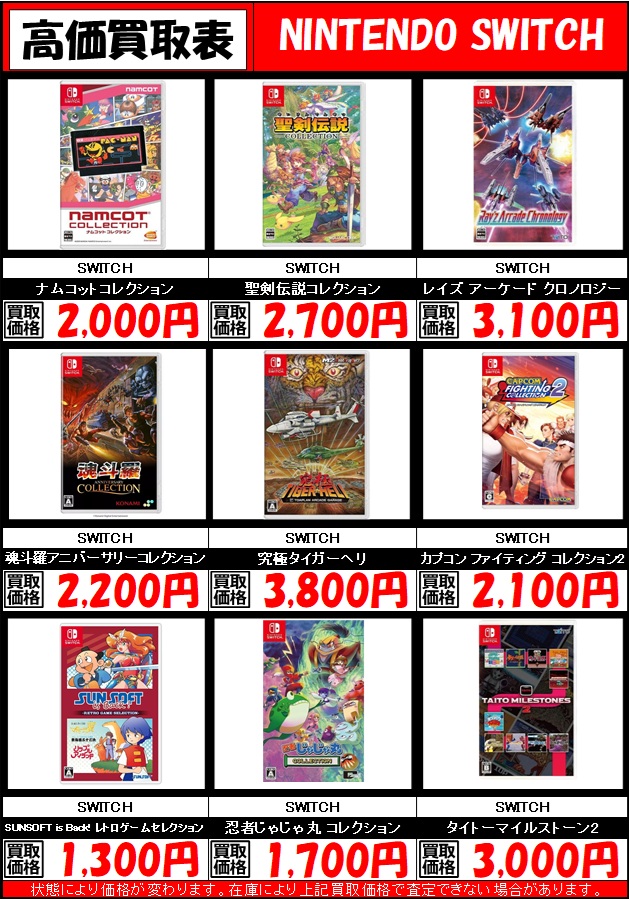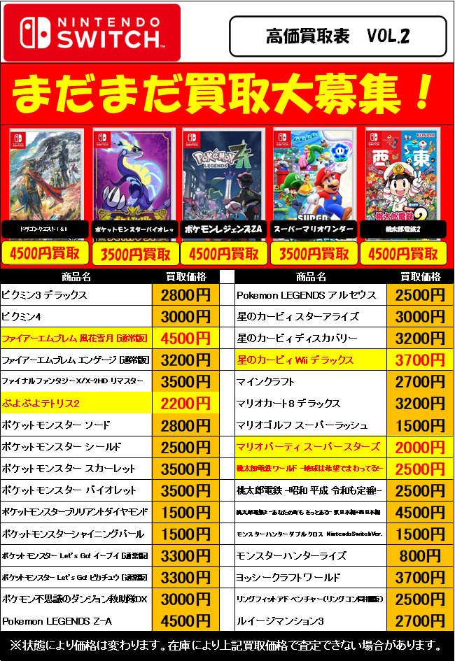 switch高価表更新しました!! 2026年1月25日 犬山五郎丸店 SWITCH, ゲームソフト, 高価表 admin_booktown 定番タイトルの高価表はコチラ!! レトロゲームの高価表はコチラ!! switch本体の高価表はコチラ!! switchソフト・本体買取大大募集中です!!ぜひブックタウン犬山五郎丸店にお持ち込みください!!