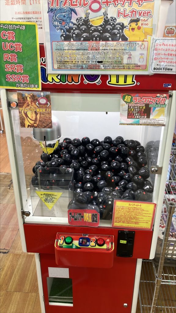 トレカクレーンキャッチャーのアームパワー強化!! 2026年4月17日 犬山五郎丸店 クレーン, トレカ admin_booktown アームパワーがMAXのため2個どりができるかも? 景品はコチラのショーケースの中から選べます!! ポケカの新品パックなどもあるので是非チャレンジしてみてね!!