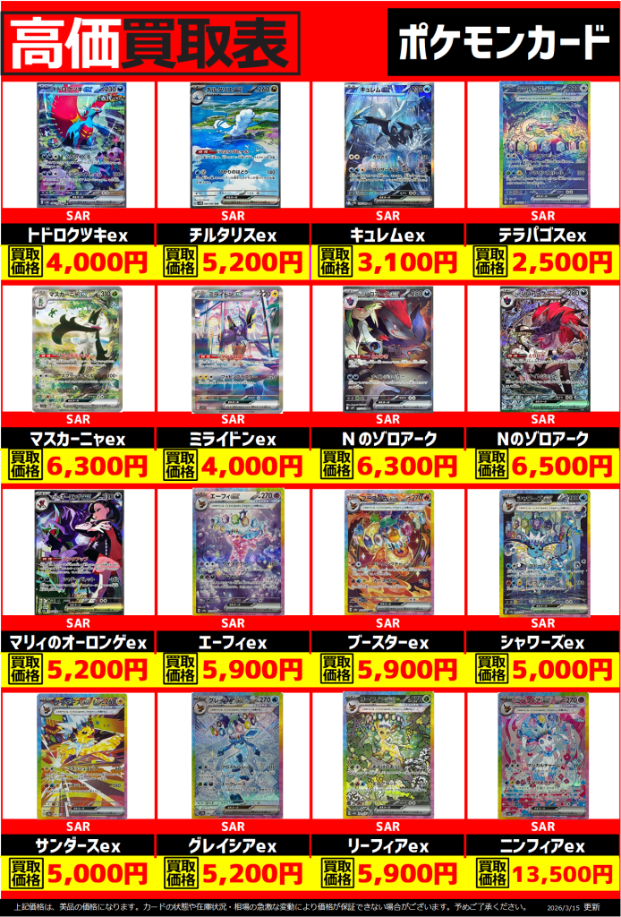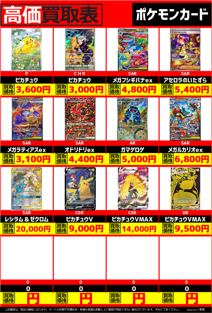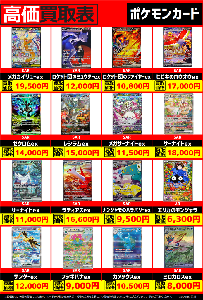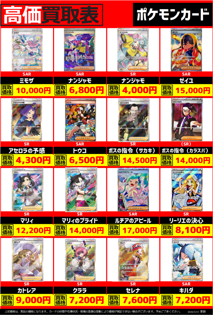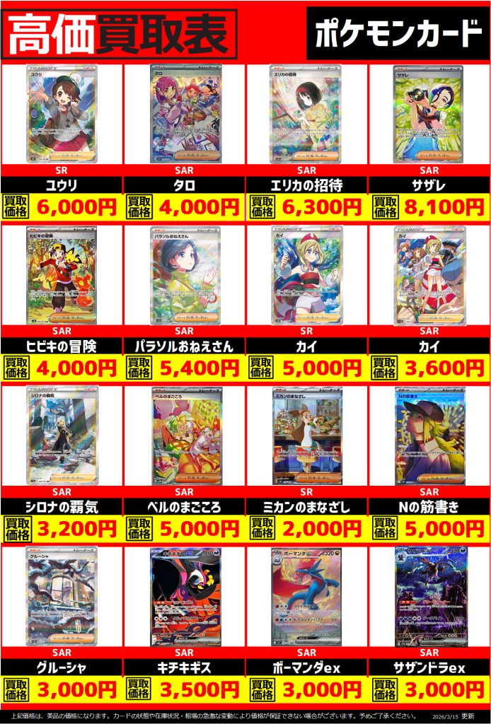 ポケカ高価表更新致しました! 2026年3月15日 瑞浪店 admin_booktown ポケカ高価表更新致しました! ※同一カード3枚以上のお持ち込みの場合は、買取金額が変動する場合がございますでの予めご了承下さい。