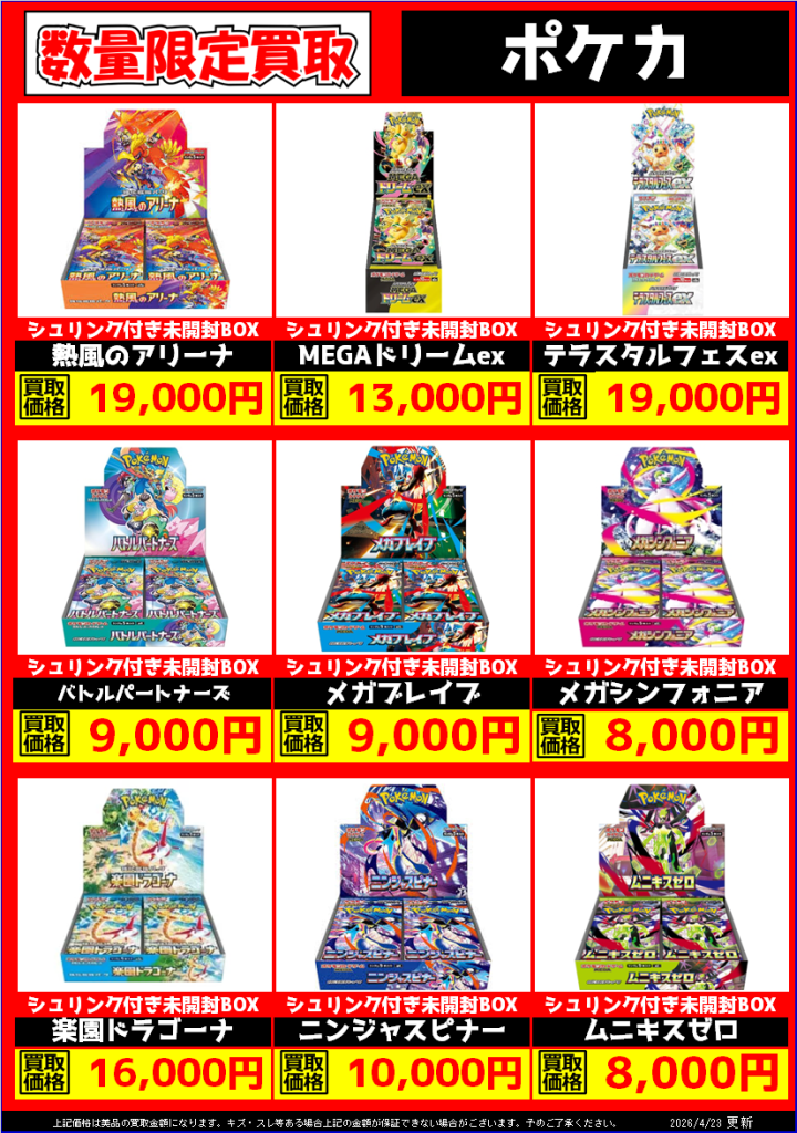 ~ポケカBOXの買取更新しました! ~ 2026年4月23日 多治見店 admin_booktown MEGAドリームex/13000 ニンジャスピナー/10000 ムニキスゼロ/8000 メガシンフォニア/8000 メガブレイブ/9000 買取おまちしております!